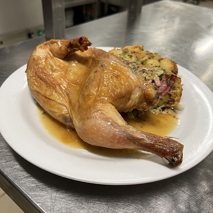 Pečené mladé kuřátko se šťávou z výpeku s žemlovou velikonoční nádivkou s uzeným masem a anglickou slaninkou.